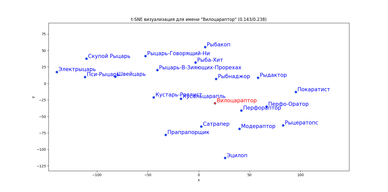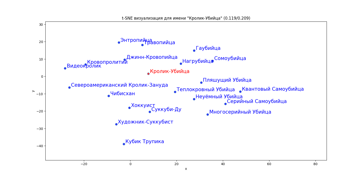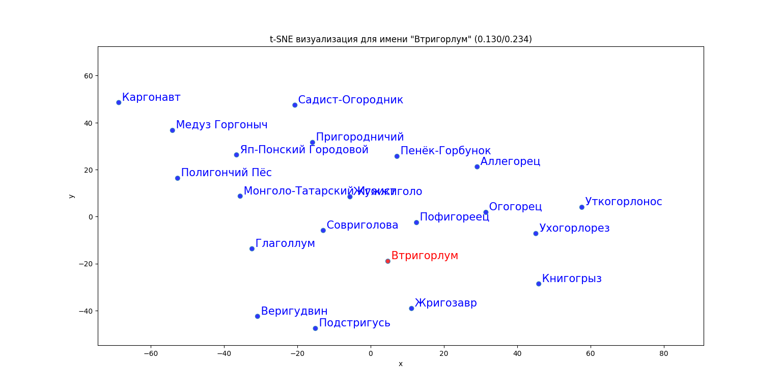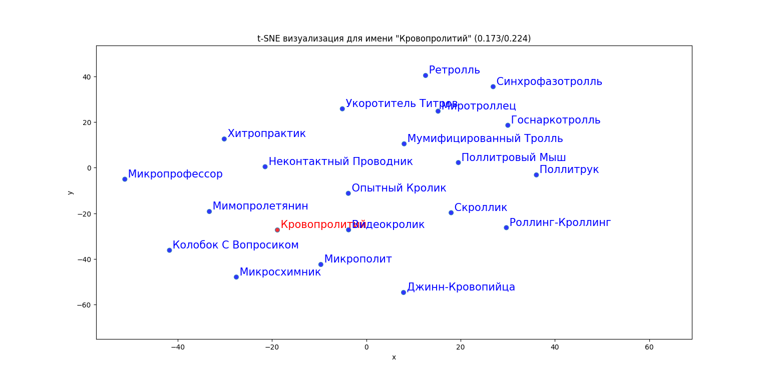 Здесь представлены графические визуализации имён годвилльского контента - "семантические облака". Те, кто хочет узнать детали алгоритма, пусть читают текст до конца. Для остальных же скажу лишь, что это способ преобразования слов в вектора ("эмбеддинги") с их последующей проекцией на плоскость. Упрощённо можно считать, что чем ближе сходство между словами, тем ближе их вектора. Рисунок состоит из центрального слова, выделенного красным, и двадцати ближайших к нему слов, выделенных синим. В заголовке графика можно видеть два числа в скобках: чем они больше, тем меньше сходство между словом и его соседями, то есть тем оно оригинальнее.