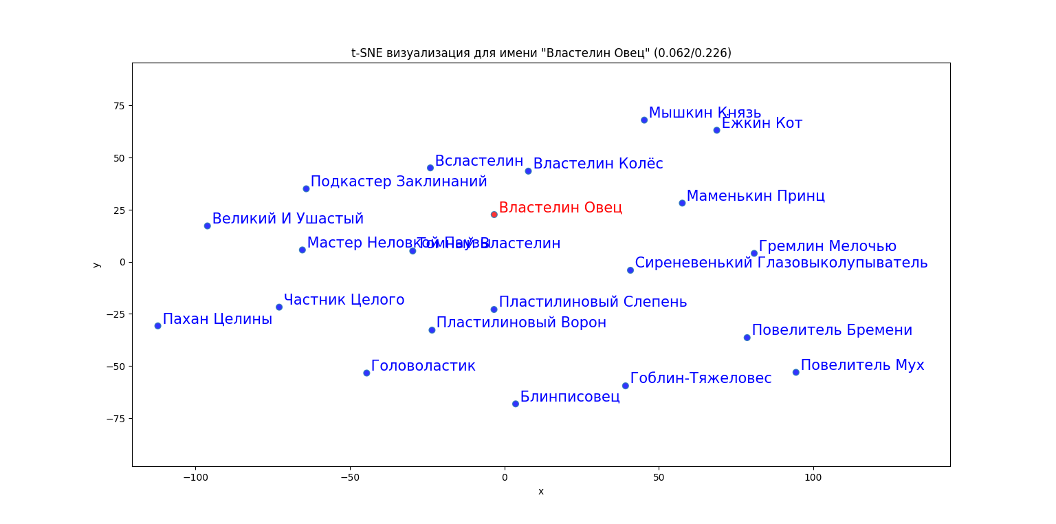 Иногда алгоритм вылавливает и менее тривиальные сходства семантики. Например, у Властелина Овец в соседях оказались Великий И Ушастый, Повелитель Мух, Мышкин Князь, Маменькин Принц. Мастер Неловкой Паузы, Пахан Целины... То есть личности выдающиеся, в том или ином смысле, и (или) коронованные