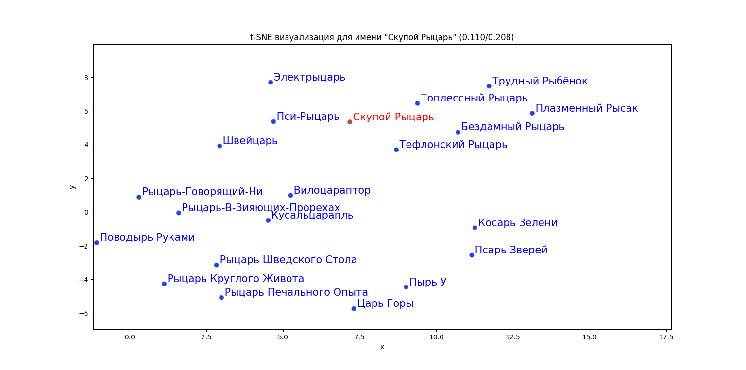 Мы видим, что окружён он в основном различными рыцарями (Пси-Рыцарь, Топлессный рыцарь, Электрыцарь и т.д.), но в компанию ближайших соседей попали также слегка созвучные Плазменный Рысак, Трудный Рыбёнок, Царь Горы ("(ры)царь") и даже Косарь Зелени ("косарь - царь - рыцарь").
